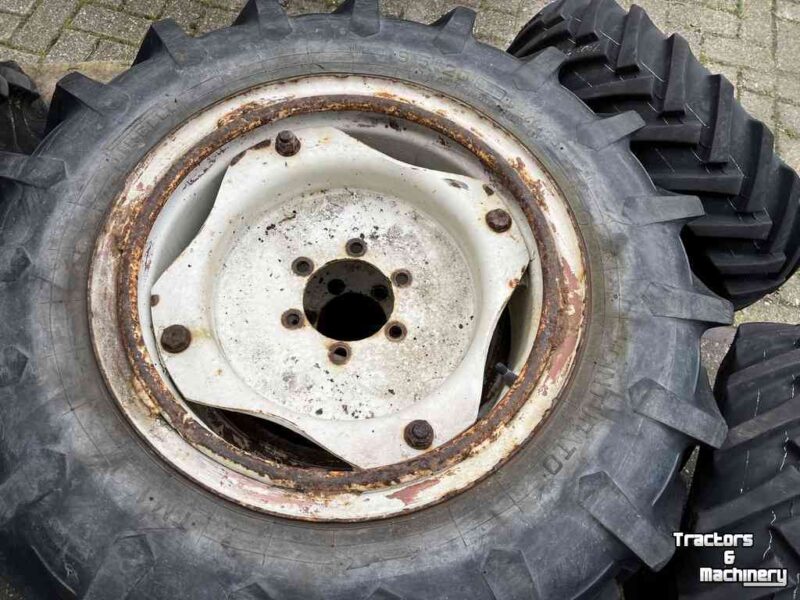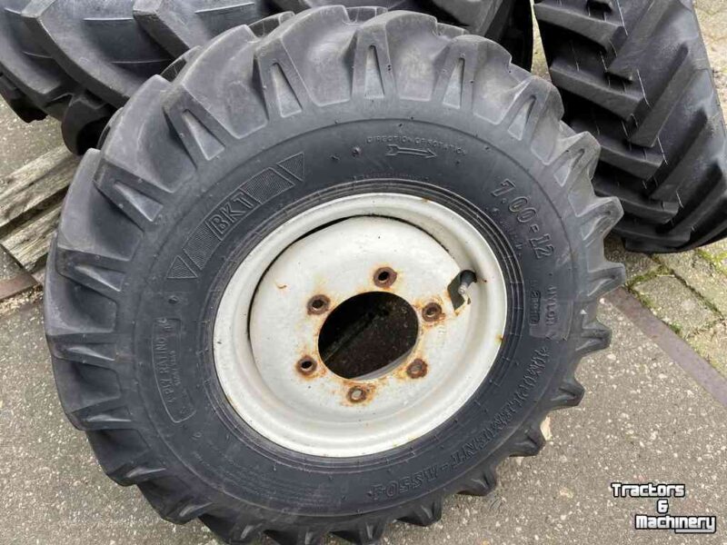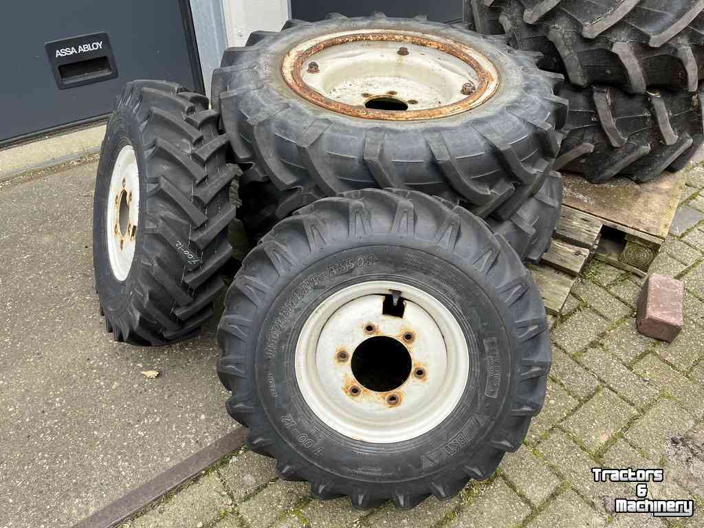 set voor en achterwieln afkomstig van een kleine New Holland trekker 9.5R20 pirelli en 7.00-12 BKT